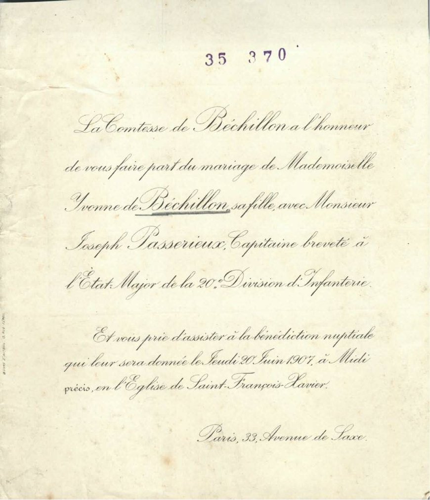 Il s’unit le 19 juin 1907 à la mairie du 7e arrondissement de Paris avec Yvonne, Laure de BECHILLON (1881-1948), sans profession, fille d’Eugène, Martin, Samuel de BECHILLON et d’Anna, Laure, Marie, Gabrielle VIBERT (autorisation de mariage en date du 21/05/1907 délivrée par le Général commandant le 10e Corps d’Armée).