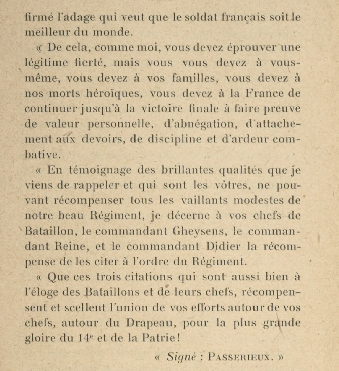 Cité à l’ordre du 17e Corps d’Armée le 1er juin 1917 : « Le 30 avril 1917 les 3 bataillons du 14e Régiment d’Infanterie commandés par les chef de Bataillon REINE, DIDIER et le Capitaine AILLERES, sous les ordres du Lieutenant-Colonel PASSERIEUX, ont enlevé de haute lutte les hauteurs puissamment fortifiées de Moronvilliers capturé 450 prisonniers, pris ou détruit 6 canons, 9 mitrailleuses et se sont maintenus sur le terrain conquis malgré les violentes contre-attaques de l’ennemi et les feux d’écharpes de nombreuses mitrailleuses ».